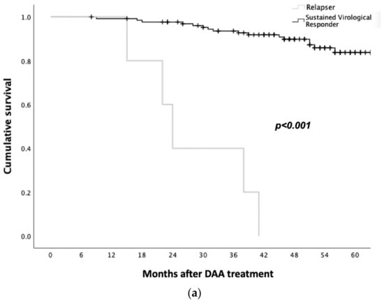 In the univariate analysis, the factors associated with lower survival were relapse after DAA treatment (p < 0.001), the platelet count < 50,000/mm3 (p = 0.003), a higher creatinine level at the baseline (p = 0.03), and the presence of liver decompensation at the baseline (p = 0.046). In the multivariate analysis, relapse following DAA treatment was confirmed as the only independent risk factor for mortality (p = 0.008) (Figure 2b).