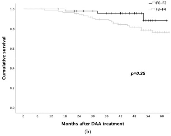 Overall, the cumulative patient survival at 1, 2, 3, and 4 years after the DAAs was 99%, 96%, 92%, and 86%, respectively. For patients with a baseline liver cirrhosis cumulative survival at 1, 2, 3, and 4 years after the DAA treatment, it was 98%, 93%, 81%, and 72%, respectively, which was not significantly different from the non-cirrhotic population, who showed a cumulative survival of 100%, 95%, 85%, and 79%, respectively (p = 0.16) (Figure 2a).