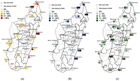 WNV seroprevalence was estimated to be 12.7% [IC 95% 9.0–16.5], ranging from 0% in Ambositra and Anjozorobe to 45.0% in Toamasina. Locations with high seropositivity levels were distributed across the whole country (Figure 1 and Table 1). Univariate logistic regression showed no association with age (p = 0.2498) or sex (p = 0.7432). Nevertheless, seroprevalence was significantly higher in sites distant from the SHC (17.0% [IC 95% 12.8–21.2], p = 0.0005) (see Supplementary Table S3 for complete univariate results).