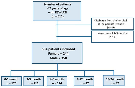 A total of 611 children were diagnosed with RSV LRTI between January 2010 and January 2019; 9 children were discharged on request and 8 patients were excluded due to nosocomial infections; an increase in the number of diagnosed cases was observed (2010—17 cases, 2011—31, 2012—32, 2013—86, 2014—66, 2015—60, 2016—50, 2017—104, 2018—100, January 2019—48 cases). Finally, a group of 594 laboratory-confirmed RSV LRTI hospitalizations was included (a flowchart of patients in the study is shown in Figure 1). The study group included 244 females (41.1%) and 350 males (58.9%), ranging in age from 7 days to 24 months, with a mean age of 4.04 (±4.56) months; detailed baseline characteristics of the study group are shown in Table 1. A total of 16 patients were transferred to the ICU (15 for respiratory failure, one for recurrent apnea), and no deaths occurred, so the latter part of the analysis was not performed.
