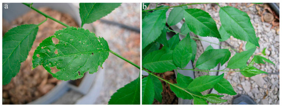PNRSV symptoms on myrobalan MRS—mild spots on the leaf (a) compared to a healthy plant (b).