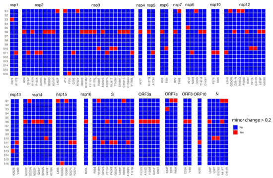Minor genomic variants were identified across all genes in SARS-CoV-2 for each patient (Figure 1 for combined patients showing non-synonymous changes and Figure S1 for individual patients showing non-synonymous changes). The data indicated that for minor genomic variants in some genes, amino acid substitutions at specific sites were tolerated, whereas in other genes these were less frequent—including the envelope (E), membrane (M), ORF6, ORF7b, and ORF10. At the level of individual patients there were some patients with very low population diversity in terms of SARS-CoV-2 minor genomic variants, including patients S9, S12, and S14 (Figure S1). There were higher-frequency substitutions in SARS-CoV-2 from some patients; for example, in SARS-CoV-2 from patient S6, there were two substitutions (C25R and V49I) in ORF8 that were approximately 40%.