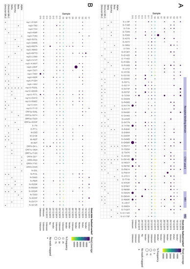 Non-synonymous substitutions in the minor genomic variants of SARS-CoV-2 from each of the 16 selected patients, focusing on sites that define VoCs (https://covariants.org/variants, accessed on 1 May 2022) in the spike protein (A) and other regions of the genome (B). Indicated for each protein is the substitution (X-axis) and its position, as well the read coverage and frequency within the viral population for each patient. Features of interest in the spike protein are indicated. Shown also is which VoC the substitution is associated with. Illumina sequence errors were removed as described in the methods.