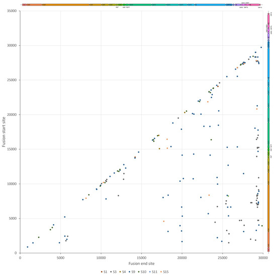Virus genome position of the start of the fusion site (Y-axis) plotted against the end fusion site (X-axis) to show the fusion events along the SARS-CoV-2 genome. Recombination events that generate subgenomic mRNAs as a result of discontinuous transcription during negative strand synthesis were excluded.
