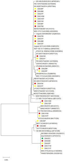 - Kumar, S.; Stecher, G.; Li, M.; Knyaz, C.; Tamura, K. MEGA X: Molecular Evolutionary Genetics Analysis across Computing Platforms. Mol. Biol. Evol. 2018, 35, 1547–1549. [Google Scholar] [CrossRef] [PubMed]