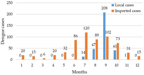 In our study, the number of imported dengue cases was high, which may be closely associated with the increased intensity and extent of dengue epidemics overseas. According to the World Health Organization, it was found that 2019 was the highest number of reported dengue cases worldwide, and all regions were affected []. As a relatively economically developed coastal region, Zhejiang Province has a large population movement, a more developed tourism industry, and frequent transportation traffic; these increase the possibility of imported dengue cases from abroad, as well as the economic cost of preventing, controlling, and treating dengue []. Imported dengue cases are an important influencing factor affecting the outbreak of dengue in China []. Health education on dengue should be made available to people entering and leaving the country, and surveillance and tracking of infectious diseases should be strengthened to minimize the disease burden caused by dengue.