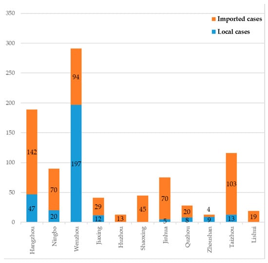 The geographic distribution of dengue cases in Zhejiang Province in 2019 is represented in Figure 2. We summarized the dengue cases of 11 prefecture-level cities in Zhejiang Province, with the top two cities with the highest cumulative number of cases being Wenzhou (291; 31.63%) and Hangzhou (189; 20.54%), accounting for 52.17% of the total number of dengue cases (Figure 2). As shown in Figure 3, we also observed that imported cases were reported in all prefecture-level cities during 2019. Hangzhou reported the highest number of imported cases at 142 (23.32%), followed by Taizhou (103; 16.91%). The number of cities affected by local cases was fewer than imported cities: eight cities were affected, with Wenzhou being the most affected (197; 63.34%).