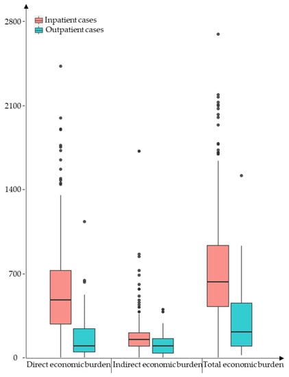 The study also found that the dengue economic burden borne by the different case types differed significantly. The average costs for outpatient and inpatient cases were USD 217 and USD 639, respectively, with a ratio of 1:4.8, suggesting that the total cost of dengue for families with inpatients is much higher than for outpatients. This may be due to (1) inpatients having more severe symptoms, greater demand for medical resources, and higher costs based on disease detection, treatment, and nursing rehabilitation than outpatients and (2) inpatients spending more time losing work than outpatients, so the indirect costs due to lost productivity will be higher. Therefore, early diagnosis, rapid treatment, and active health education would help reduce the cost of hospitalized cases and also reduce the household economic burden of dengue. In 2010, the per capita cost of dengue hospitalization in Brazil was USD 516 []. A study of the economic burden of dengue outpatient and inpatient cases in 2017 found that the total per capita cost of inpatient cases in three dengue-endemic countries, Vietnam, Thailand, and Colombia, had a maximum of USD 385 and a minimum of USD 141, with outpatient costs ranging from USD 40 to USD 158 []. They were all lower than the median cost in this study (outpatient: USD 217; inpatient: USD 639), suggesting a higher economic burden of dengue in Zhejiang Province.