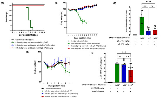 The virus was intranasally administered, with the mice being previously anesthetized with 65 mg/kg of Ketamine and 13 mg/kg of Xylazine. IgG-A7 was given intraperitoneally (i.p.) in a single dose of 0.5 or 5 mg/kg 24 h post-infection to groups of ten mice per dose (five male and five female). Their survival, body weight, and clinical signs were monitored daily for 14 days for infection with Delta. Their clinical signs and body weight were monitored for 7 days for infection with Omicron. The viral load in the lung was determined via RT-PCR to detect SARS-CoV-2 E gene copies on day 14 post-infection. The mice were euthanized when they showed irreversible signs of disease. Active virus manipulations, as well as efficacy studies, were performed at BSL2+ facilities, with strict biosafety standards and risk assessment protocols according to the specifications of the WHO Laboratory Biosafety Manual, Four Edition and the CDC Guidance for General Laboratory Safety Practices during the COVID-19 Pandemic [9,10,11,12].