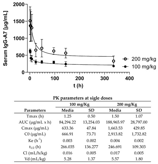 Serum concentration–time of IgG-A7 in mice serum samples at 100 mg/kg and 200 mg/kg. Each data point is the Average ± Standard Deviation (SD) of triplicate antibody quantification by ELISA of 4 mice (2 males and 2 females); n = 4. Raw data for males and females are reported in Supplementary Material Tables S2 and S3. The table underneath the figure compiles the PK parameters calculated at 100 and 200 mg/kg single doses. Average and SD values of Tmax: time to reach Cmax; Cmax: maximal serum concentration; C0: estimated initial concentration; ke: elimination constant; t1/2: serum elimination half-life; AUC0-t: area under the curve until last sampling time; Cl: clearance; and Vd: Volume of distribution.