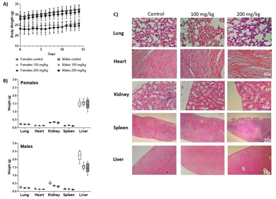 All the analyses were performed by the MAULAB Veterinary Clinical Pathology Laboratory (Benito Juárez, Mexico City, Mexico, https://maulab.com.mx/; accessed on 31 December 2022). For the urinalysis, urine pools from three male or three female mice were analyzed. The physical appearance (color, and urine density) was assessed. Further, a chemical examination (pH, proteins, glucose, ketones, bilirubin, urobilinogen, Blood/Hb, erythrocytes, leukocytes, squamous epithelial cells, transitional epithelial cells, and cylinders) was determined. In addition, microscopic examination (crystals, bacteria, lipids, and others) was performed. For hematology, impedance (EXIGO H400) and wright-stained blood smears were performed to determinate: the hematocrit (HCT), hemoglobin (HGB), erythrocytes (RBC), Mean Corpuscular Volume (MVC), Mean Corpuscular Hemoglobin Concentration (MCHC), platelets (PLK), White Blood Cells (WBC), neutrophils, lymphocytes, and monocytes. The toxicological analysis included blood chemistry of the following parameters: glucose, urea, creatinine, cholesterol, triglycerides, total bilirubin, Alanine Transaminase (ALT), Aspartate Aminotransferase (AST), Alkaline Phosphatase (AP), Creatinine Kinase (CK), total proteins, albumin, globulins, A/G ratio, calcium, and phosphorus. Finally, the organs (lungs, hearts, kidneys, spleens, and livers) were processed for microscopic examination with sections of the kerosene block in the microtome (5 mm) and were stained with hematoxylin and eosin. The slide analysis was carried out at magnifications of 10× and 40×.