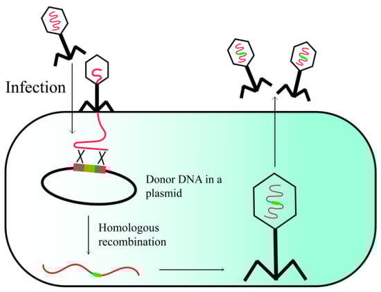 Homologous recombination (HR) is a highly versatile strategy for phage genome engineering, which can occur between two DNA fragments that share only limited regions of homology (Figure 1). To execute HR, exogenous DNA segments containing flanking regions homologous to the phage genome sequence are initially cloned into a vector [16]. The homologous regions dictate the integration site of exogenous DNA segments within the phage genome. The host strain carrying the donor vector is subsequently infected with the engineered phage. In vivo, homologous recombination (HR) occurs between the vector and the phage genome, facilitated by host recombinases, such as RecA. This process enables the integration of foreign DNA fragments into the phage genome, which are ultimately packaged within the phage particles [17]. Recent studies have demonstrated that retrons possess the ability to function as a recombination template, without the need for lengthy homologous flanking sequences. This feature facilitates a rapid and uncomplicated cloning procedure, although the insertion of large fragments may be limited by the restricted size of the homologous domain in the retron, which typically spans 75 base pairs (75 bp) [18,19]. However, one significant drawback of engineering methods based on homologous recombination is the relatively low efficiency of recombination, which necessitates time-consuming and labor-intensive screening methods to identify recombinant phages. This limitation arises from the inability to employ selectable markers, such as antibiotic resistance genes, during the lytic growth phase of phages. To streamline the screening process, it is feasible to integrate marker genes that enable a targeted selection for mutated phages or to employ a subsequent counter-selection technique to remove the wild-type phages (refer to the subsequent sections for more information).