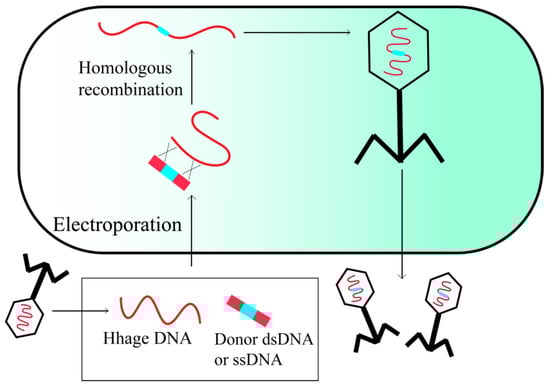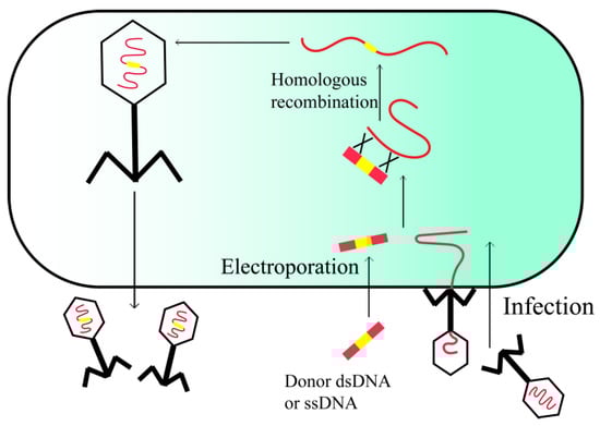 Recombineering relies on linear donor DNA and heterologous proteins, including Gam, Bet, and Exo, which are expressed from the phage genome. These proteins protect linear dsDNA from intracellular degradation and promote recombination between the linear donor DNA and the injected phage genome. This process increases the frequency of recombination and reduces the length of homologous regions to as little as 50 bp [21]. The enhanced accessibility of phage genome sequences has greatly facilitated the convenience of recombineering, as it is only viable to recombine a phage with a known genome sequence [22].