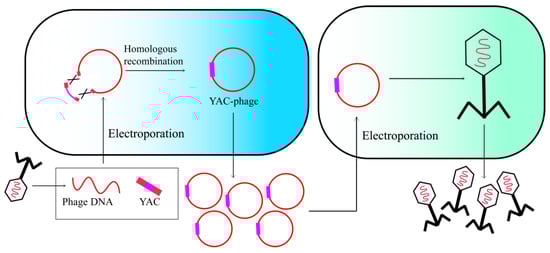 Phage genome modification can be achieved by utilizing a yeast cell as an alternative host for phage assembly. The intrinsic capacity of Saccharomyces cerevisiae, a yeast species, to recombine linear double-stranded DNA fragments into a single genome facilitates genetic modifications and empowers the generation of engineered phages [28]. To assemble the complete phage genome in yeast, PCR amplification is conducted with homologous termini that are retained with at least 30 bp in length. The initial and final genome fragments are amplified using primers that contain homologous sequences with a yeast artificial chromosome (YAC). All amplified segments of the genome and YAC are subsequently transformed into S. cerevisiae, where gap repair enables a recombination-mediated joining of all phage genome segments (Figure 4). After purifying the recombinant vector, the phage genome can be assembled to generate phage particles upon transformation into the host bacteria. The resulting plaques are subsequently selected and sequenced to confirm the successful incorporation of the desired mutations [29]. This phage engineering strategy has been utilized to genetically modify multiple phage genomes, such as T3 and φX174 coliphages, as well as Klebsiella phage K11 [28,30,31].