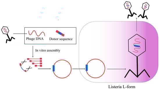 The limited ability of Gram-positive bacteria to undergo transformation poses a significant obstacle in the reactivation of engineered phages that target these hosts. However, this limitation can be overcome by substituting the robust cell walls of Gram-positive hosts with L-form bacteria, thereby enabling the reactivation of the synthetically constructed phage genome. L-form bacteria are cell-wall-deficient organisms that are capable of undergoing transformation with macromolecular DNA, as well as replicating and transcribing newly introduced genetic molecules. Drawing on these advantages, L-form bacteria were assessed as potential hosts for rebooting the synthetic genomes of phages (Figure 5). Furthermore, Kilcher et al. demonstrated the ability to reboot various Gibson assembled or wild-type phage genomes in L-form Listeria monocytogenes or related Gram-positive hosts. L-type bacteria release phage particles via hypoosmotic lysis, which enables the phages to infect specific bacterial hosts for reproduction. The L-forms of Listeria monocytogenes have been found to possess the potential to serve as a platform for the reactivation of Bacillus and Staphylococcus phages, indicating the intergeneric applicability of L-form cells in phage genome engineering [34]. This discovery is of significant interest and may have important implications for the development of novel strategies for phage-based therapies.