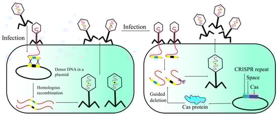 The CRISPR-Cas system is a naturally occurring adaptive defense mechanism present in numerous prokaryotes, which confers sequence-specific protection against invasive nucleic acids [36,37,38]. The CRISPR-Cas system comprises two genetic components: Cas proteins and the CRISPR array [39,40,41]. The type I-E CRISPR-Cas system has recently been utilized as a counter-selection mechanism for engineered T7 phages (Figure 6). The phage underwent homologous recombination-mediated editing to excise the dispensable gene 1.7 [42]. The strategy selectively eliminated nonrecombinant phage genomes harboring gene 1.7, while sparing the recombinant phage genomes devoid of this gene. Similarly, the CRISPR/Cas II-A system can also be utilized for in vivo editing of the phage 2972 genome, encompassing point mutations, gene deletions, and DNA exchange [37]. Given the successful genetic manipulation demonstrated in the above results, the CRISPR/Cas strategy holds promise for application to other phage genomes.