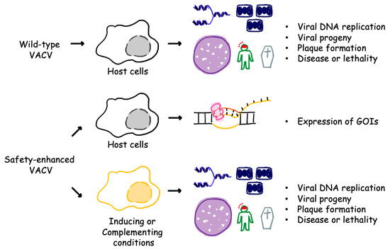 VACV with extra safety features cannot propagate in host cells. Wild-type VACVs without built-in safety mechanisms can establish an active infection. The outcomes include viral DNA replication, generation of progeny, formation of plaques, and potentially the development of diseases or death. VACVs with enhanced safety features can produce the same outcomes only if an inducing or complementing condition is provided but will not lead to an active infection in host cells. GOIs: genes of interest.
