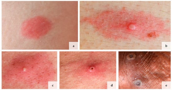 According to systematic investigations of the current outbreak in larger patient collectives, the infection shows a staged course: After a short prodromal stage with fever, fatigue, and lymphadenopathy, a few days later, the first skin lesions appear, progressing through various characteristic stages before healing within 14–21 days [2,6,12,13,16,17,18,19,20,21,22,23,24]. Clinically, the lesions usually start with a macule on which a small whitish papule forms centrally. In some cases, secondary pustule formation occurs before the papule ulcerates. The late stage shows ulceration covered by dry necrosis and can be very painful in some cases [6,17,20,22,23,25]. Some lesions heal with scarring [26].