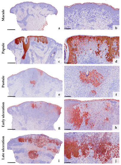 A total of five biopsies were taken from four different patients representing the different stages of the disease (Table 1). The initial macular stage showed mainly superficial and deep perivascular but also interstitial inflammatory cell infiltrates predominated by lymphocytes (Figure 2a). Some lymphocytes were medium to large in size. The junctional zone showed vacuolar changes (Figure 2b). Only a subtle pallor of the epidermis could focally be identified. Only a few neutrophils were scattered superficially and deeply perivascularly and interstitially within the dermis at this early stage. (Figure 2b). The histology of the papular stage showed a clear increase of inflammatory cells (Figure 2c). Numerous neutrophilic granulocytes were then found in the infiltrate (Figure 2c,d). The epidermis was pale with ballooned keratinocytes. Hair follicle epithelia were similarly affected (Figure 2d). Additionally, some multinucleated keratinocytes and some keratinocytes with eosinophilic inclusion bodies (so-called Guarnieri’s inclusion bodies) could be identified, the latter especially at the upper layer of the lesional skin (Figure 2d). The pustular stage demonstrated a further increase of neutrophilic granulocytes, some of them forming larger intraepidermal and intrafollicular collections (Figure 2e,f). In the stage of early ulceration, the epidermis was mostly necrotic. At the superficial vascular plexus, a strong diapedesis of inflammatory cells were seen, among them neutrophilic granulocytes also within the walls of small vessels as well as the initial formation of intravascular fibrin thrombi. (Figure 2g,h). Histopathologic changes of the vessels themselves, such as fibrin deposition within the vessel walls and perivascular leukocytoclasia, could not be observed at this stage (Figure 2h). These changes could be detected in the late stage of ulceration, in which numerous damaged vessels showed fibrin deposition within the vessel walls as well as intraluminal fibrin thrombi surrounded by erythrocyte sludge together with a strong diapedesis of neutrophils with extravasated erythrocytes and moderate leukocytoclasia around the postcapillary venules (Figure 2j). Details of the systematic semiquantitative histomorphological evaluation of the biopsies are shown in Table 2.