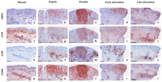 Anti-Vaccinia virus antibodies marked the cytoplasm of keratinocytes in all samples except the early macular stage (Figure 3a–j). The reaction was particularly strong within the epithelial keratinocytes of the hair follicles and the adjacent epidermis (Figure 3c,e,g). Macrophages surrounding an obliterated blood vessel in the late stage of ulceration were also labelled by the anti-Vaccinia virus antibodies (Figure 3i,j). Immunohistochemical staining with myeloperoxidase (MPO) confirmed the increasing invasion of neutrophilic granulocytes from only a few scattered dermal neutrophils in the macular stage (Figure 4a) to extensive infiltration of the epidermis and hair follicles (papular stage, Figure 4b), resulting in a formation of intraepidermal and intrafollicular aggregations (pustular stage, Figure 4c). In the early and especially late stage of ulceration, staining with MPO additionally marked an increasing diapedesis of neutrophils at the postcapillary venules (Figure 4d,e). The inflammatory infiltrate was predominantly composed of CD4+ T cells in the macular stage. In the later stages, the infiltrate was dominated by CD8+ T cells and neutrophilic granulocytes (Figure 4f–o). The immunohistochemical staining with CD68 showed strong reactivity with the macrophages around vessels and adnexal structures in all stages. Additionally, it marked some interstitial macrophages but also showed cross-reactivity with neutrophilic granulocytes (Figure 4p–t). Details of the systematic semiquantitative immunohistochemical evaluation of the biopsies are shown in Table 2.