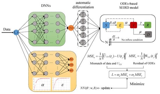 The PINNs framework is required to fit the data and simultaneously satisfy the equations, whereby the loss function includes two parts. The first part is the mismatch between the network output and the available data, and another part is the residual of ODEs. In this study, we employ the approximation to represent the time-varying SEIRD equations (Equation (3)). The parameters are optimized to achieve the best fit with the observed data. Considering the available data at times as training points (ground truth), the mean squared error (MSE) is calculated as follows: