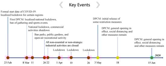 For the COVID-19 epidemic in Italy, the first official report of indigenous case was on 21 February 2020 in Lodi province, while several epidemiological-linked cases were traced back to 20 February 2020. The data considered in our study is downloaded from Italian Civil Protection (http://www.protezionecivile.gov.it/media-comunicazione/comunicati-stampa) and Ministry of Health (http://www.salute.gov.it/portale/home.html). It is comprised of commutative infected, recovered, and deceased cases for the period from 20 February 2020 (day 1), to 30 June 2020 (day 132) [30]. In order to control the transmission of COVID-19 in Italy, lockdown and many NPIs were implemented from 23 February 2020, as the developed timeline shown in Figure 2. All events and interventions are available from official websites (https://mn.gov/governor/covid-19/news/). To avoid weekly fluctuations induced by the work-leisure shift and nature noise in the real-world data, a 7-day moving average was used to smooth the reported data by averaging the values of each day with those of the 7 days before.