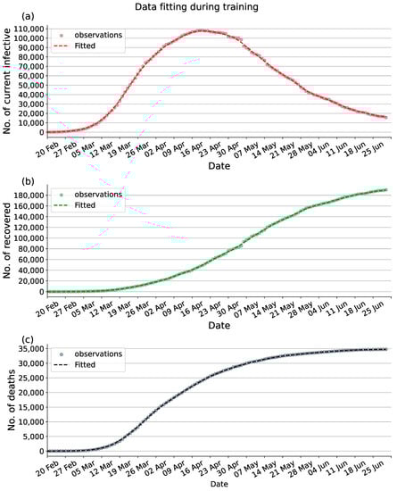 Data fitting during training. (a) Fitting to the available data of current infectious. (b) Fitting to the available data of cumulative recovered. (c) Fitting to the available data of cumulative deaths. Dot: observed data. Dashed: Fitted data.