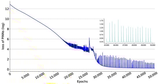 Loss of PINNs during the training process. The value of the Equation (6) is taken as log. The subplot shows the loss of the last 5000 epochs of training, with all loss values less than 2, which is a minimal loss compared to the range of values of the ODEs.