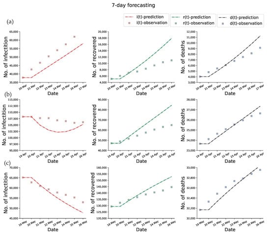 We tested the forecasting power of the proposed method by performing predictions for the early outbreak of COVID-19 in Italy at one-month, two-month, and three-month, respectively. The ODEs-based compartmental model requires determined initial conditions and model parameters to make predictions. As the initial conditions can be obtained from the training data and the model parameters are already calibrated, we can forecast the epidemic dynamics by performing the forward process. In the prediction part, the value of , , and are assumed to be their final value of the training time window. Figure 5 displays the data fitting and prediction obtained by using the proposed PINNs method for the SEIRD model. Figure 5a displays the one-week prediction based on the reported data from 20 February to 20 March 2020, Figure 5b displays the one-week prediction based on the reported data from 20 February to 19 April 2020, and Figure 5c displays the one-week prediction based on the reported data from 20 February to 19 May 2020. The perfect match between the predictions and the observations demonstrates the parameters inferred by the learned network are very plausible, as well as the generalization ability of the model. Note that the number of recovered and death states in the SEIRD model are terminal states, which means that the changes in the number of recovered and death people are always non-decreasing. In turn, the infected people may see periods of increase and decrease due to it being a state of transition.