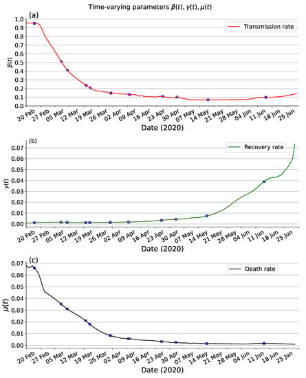 Estimating the unknown parameters in compartmental models is crucial for understanding the dynamics of disease transmission and evaluating the effectiveness of interventions. These parameters, including transmission rates, incubation period, recovery rate and mortality rate play a pivotal role in shaping the spread of infectious diseases. The incubation period and the infectiousness during this period are parameters specific to the virus, which can be obtained from clinical case information or inferred using statistical or mathematical modelling based on available data. The estimated incubation period of COVID-19 is approximately 5.8 days, with the infectiousness during this period found to be nearly equal to 99.9% of the infection period. Figure 6 presents the estimated time-varying parameters in Italy from 20 February to 30 June 2020. This analysis provides insights into how the values of , , and change over the specified period, reflecting the impact of interventions and other factors on the dynamics of the disease. As shown in Figure 6a, the transmission rate can fit well with what would be expected given such events. The earliest traceable first confirmed case of COVID-19 on 20 February 2020, the authorities of Italy started imposing a localized lockdown for certain regions on 23 February 2020, these control measures achieved a certain success, as demonstrated by a significant reduction in transmission rates . As far as and , hospitals’ ability particularly emergency rooms had a considerable impact. In the context of COVID-19, hospitals are at full capacity in the first months of the outbreak, and as months went by, healthcare professionals learned more about possible treatments to treat the disease’s symptoms and effects. This usually results in a decrease in the proportion of individuals that died from the disease (decrease of ) and in a decrease in the recovery time (an increase of ). As shown in Figure 6b,c, in qualitative terms, was an increasing trend in and a decreasing trend in .