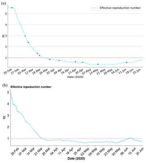 in Italy from 20 February to 30 June 2020. (a) Rt estimated by proposed PINNs method for SEIRD model. (b) estimated by serial Bayesian model.