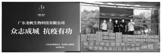 (Left) the local government awarded Wu’s company a medal for meritorious efforts in combating the epidemic. (Right) Wu’s company donated epidemic prevention materials.
