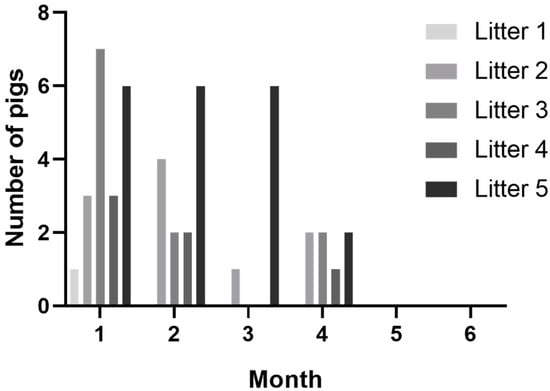 There was a large variation in the number of pigs that developed tremors between the CT-positive litters, which is similar to that previously reported by both observational studies in the field and experimental challenge studies [1,4,7,14,24]. Even in experimental infections where each fetal amniotic vesicle was directly inoculated, not all pigs developed CT [4]. It is still unknown why some pigs develop tremors and others do not, as APPV has been detected in both symptomatic and asymptomatic pigs within affected litters [4,11,24,25]. Clinical disease is likely a combination of factors that could include timing of infection, quantity of viral exposure, innate immune response, and genetics. Not only can there be variation in the number of pigs that develop tremors in a litter but also the severity of tremors, which can range from slight muscle twitches to the entire body trembling [2,14]. Pre-weaning mortality can increase due to the severity in some pigs, but for most pigs, clinical signs will eventually resolve over time, as was observed in pigs followed during this study [7,24,26].