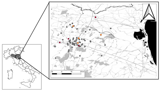 Map of collected wild birds (n = 164) in the study area. Red dots indicate birds tested positive for USUV RNA, orange dots indicate WNV RNA positive, and grey dots indicate Flavivirus-negative birds. The position of the Emilia-Romagna region is in the lower-left corner of the figure.