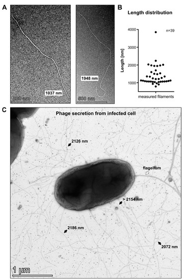 Filamentous phages from the family Inoviridae are long and thin filaments (6–8 nm in diameter and 800–2000 nm in length) that contain a circular ssDNA genome [1,2,3,4]. The phage filament itself is composed of several thousand subunits of the phage’s major coat protein, which are usually between 44 and 86 amino acid residues in length and are arranged in a helical array around the ssDNA core [4,5]. The ends of the filaments, on the other hand, consist of only a few copies of minor coat proteins. The size of the phage filament is often a function of the size of the genome, which ranges from 4 to 12 kbp and which encodes 4 to 17 or more genes [2,4].