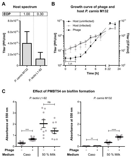 Physiological analysis of PMBT54: (A) Efficiency of plating (EOP) of phage PMBT54 on susceptible Pseudomonas strains. Preliminary spot tests were conducted on 27 Pseudomonas strains (see Table S1) to test host susceptibility. The EOPs of the phage (propagated on P. carnis M132) were subsequently determined on overnight cultures of the two identified susceptible strains, P. lactis L1-92 and P. carnis M132. Error bars indicate the standard deviation of five biological replicates. (B) Growth curve of PMBT54 on isolation strain P. carnis M132 and growth curves of P. carnis M132 (infected and uninfected). The host strain was infected at a MOI of 0.1, and both phage and bacterial titres were measured at regular intervals for 7 h post-infection and after overnight incubation. Error bars indicate the standard deviation of three biological replicates. L.p. = latent period. (C) Biofilm formation of uninfected and infected host bacteria in Caso broth and 50% milk medium. Biofilm formation was quantified by crystal violet staining and absorbance measurement at 550 nm. Data points of three biological replicates, each encompassing three technical replicates, are illustrated as dots. Bars represent the mean of all points, including standard deviation. Statistical significance was assessed by calculating the p-values of two indicated samples using an unpaired t-test; ns = p ≥ 0.05 (not significant); ** = p ≤ 0.01; *** = p ≤ 0.001; **** = p ≤ 0.0001.