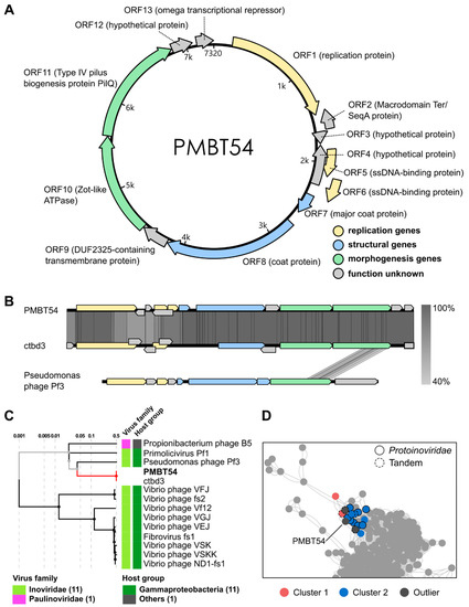 For the taxonomic classification of PMBT54, we first checked whether PMBT54 showed any similarities to entries in the NCBI Blast database (https://blast.ncbi.nlm.nih.gov/Blast.cgi, (accessed on 8 March 2023)), and we found a closely related inovirus genome termed ctbd3 (coverage: 100%, identity: 97.07%, accession: MH616883, Figure 3B), which had been previously sequenced as a part of a metagenomic study from various animal samples but had not yet been isolated [39].