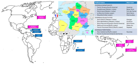 In terms of arboviral risk, the diversity in the geographical distribution of French territories leads to the circulation of a wide variety of vector species across space and time [9]. French territories are exposed to a variety of epidemiological situations, e.g., in mainland France, the absence of arbovirus circulation in certain areas, the circulation of endemic pathogens in animal cycles with occasional human spillovers (West Nile virus (WNV), Usutu virus (USUV), and tick-borne encephalitis virus (TBEV), and in recent years, in southern regions, the indigenous circulation of ‘tropical’ arboviruses such as dengue virus (DENV), chikungunya virus CHIKV), and Zika virus (ZIKV). In the overseas territories, dengue fever is endemic and epidemic in most tropical areas (Caribbean islands, French Guiana, islands in the south-west Indian Ocean, Pacific territories) and Zika and chikungunya have caused epidemics in all regions (except in the south-west Indian Ocean for Zika). Global warming is also a major factor affecting the distribution and vectorial capacity of arbovirus vectors [10], particularly in temperate zones that were previously protected from this risk.
