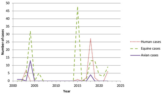 Number of annual cases of West Nile virus infection identified in humans, horses, and birds in mainland France, 2001–2022 (source: Santé publique France).