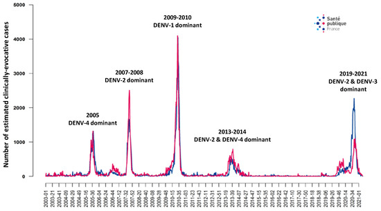 Endemic and epidemic circulation of dengue virus on Martinique (blue line) and Guadeloupe (red line) islands, 2003–2021. The more prevalent serotype(s) is (are) shown for each outbreak. Source: Santé publique France.