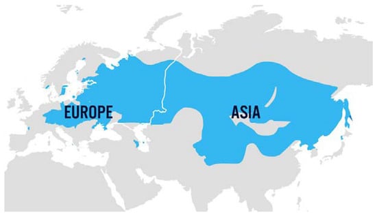 Ticks belonging to the Ixodes ricinus and Ixodes persulcatus species are considered the main natural vectors, but Dermacentor reticulatus was recently also shown to be an effective vector of TBEV [64]. The geographical distribution of TBEV is Europe and Asia (Figure 4) [65]. According to the stages of development of the tick, the natural reservoir of TBEV mainly constitutes small rodents, birds, and wild ungulates (mainly cervids) that are present in the natural environment of endemic areas (mainly forests and grassland areas with sufficient rainfall) [66]. Ticks can also acquire the virus transtadially (from larva to nymph to adult ticks), transovarially (from adult female tick to eggs), or when cofeeding on animals. Humans and domestic mammals, including dogs, goats, sheep, and cows, may be contaminated by tick bites. Besides tick bites, humans can be infected by the alimentary route via unpasteurized milk or milk products from animal origin (for reviews, see [67,68]).