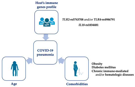 Therefore, we performed multivariate analysis to identify risk factors affecting the clinical presentation and outcome of COVID-19, including all parameters that were ascertained in univariate analyses. Elderly patients with obesity and/or diabetes mellitus were more vulnerable to developing pneumonia and respiratory distress syndrome, following SARS-CoV-2 infection (Table 5). Moreover, individuals with a medical history of hematological and/or chronic immune-mediated diseases were more susceptible to developing pneumonia and severe disease, while patients with hypertension displayed an approximately 3-fold increased probability of developing more severe disease (Table 5). Additionally, we observed that the presence of the IL18-rs1834481 polymorphism was an independent risk factor for developing pneumonia, also displaying a 1.7-fold increased risk for more severe disease; although the latter was not marginally reached to statistical significance (Table 5). Finally, carriers of either TLR2-rs5743708 or TLR4-rs4986791 polymorphism also displayed a significantly increased risk for developing pneumonia and more severe disease (Table 5). An overview of the significant risk factors that contributed to the development of pneumonia in our cohort of COVID-19 patients is presented in Figure 1.