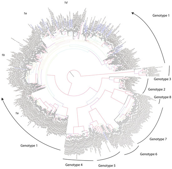 All available genomes from the HDVDB (https://hdvdb.bio.wzw.tum.de/hdvdb/, accessed on 20 April 2023) [31] were downloaded when building the reference dataset. After removing duplicates and ubiquitous sequences without genotype or date of sampling information, the reference dataset consisted of 511 sequences spanning genotypes 1 to 8 (see Supplementary Materials).