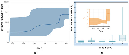 To build multiple sequence alignments based on nucleotide data, MAFFT v7 [32] was employed with the L-INS-i option. First, the Bayesian Evolutionary Analysis by Sampling Tree (BEAST) v2.6.3 [35,36] program was employed to perform a Coalescent Bayesian skyline analysis with time constraints based on the sampling dates to determine the tree prior. The strict molecular clock option and HKY+G+I site model were applied in BEAST v2.6.3 before running the Markov chain Monte Carlo algorithm for a chain length of 300 million states while sampling every 30,000. All effective sample size (ESS) values were greater than 300. It should be noted that a parallel relaxed clock analysis did not converge after 300 million states. A Bayesian skyline reconstruction was then implemented using Tracer v1.7 [37]. Based on the Bayesian skyline results, a birth-death model was selected for the tree calibration analysis (Figure 3). The strict molecular clock and BEAST Model Test site model were also selected, and the Markov chain Monte Carlo algorithm was run for 500 million states using BEAST v2.6.3 while sampling every 50,000. All ESS values were greater than 5000. Next, TreeAnnotator [38] was employed to infer the best tree with maximum clade credibility, tree type, and ancestor heights as node heights. Finally, tree management visualization and calibration were performed using Figtree v1.4.4. For estimating the reproduction rates, a birth-death skyline serial prior was applied, since data were asynchronous. Specific priors were also modified according to the following: Become Non-infectious Rate (Log Normal, S = 2) and Reproductive Number (Log Normal, S = 1.25). For the sampling proportion, a combined (natives and immigrants) number of about 5 million infectious individuals in Italy was estimated according to Caviglia et al. [39]. Therefore, the sampling Proportion prior (Beta distribution, Alpha = 1, Beta = 9999) was modified. Using Beast v2.6.3, the Markov chain Monte Carlo algorithm was run for 300 million states, while sampling every 30,000. Then, BDSKY Tools package in R [40] was employed to construct a corresponding figure (Figure 3b). All ESS values were greater than 2000.