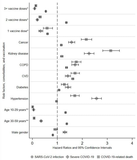 In the multivariable analyses (Table 3 and Figure 1), as compared to the elderly, the likelihood of COVID-19 or COVID-19-related death were >90% lower among the youngest, and the presence of all comorbidities was independently associated with a higher (ranging from +28% to +214%) risk of both outcomes. Compared to the unvaccinated, the subjects who received any dose of vaccine showed a substantially lower likelihood of both severe COVID-19 and COVID-19-related death, with a clear dose–response trend (for COVID-19: HR = 0.33 for those who received one dose only; HR = 0.20 after two doses only; HR = 0.09 for those who received at least one booster dose). Finally, a positive association was observed between male gender and severe COVID-19 only (HR = 1.30).