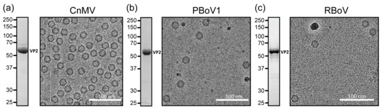 Expression and purification of CnMV, RBoV, and PBoV VLPs. (a) An SDS-PAGE of CnMV showing a band at 60 kDa consistent with VP2. To the right, a cryo-EM micrograph of the same sample shows intact capsids of ~25 nm in diameter. (b) Depiction as in (a) for PBoV1 and for (c) RBoV.