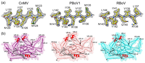 The VP structure of CnMV, PBoV1, and RBoV. (a) Amino acid residues modeled for the βD strand are shown inside their density maps at a sigma (σ) threshold of 2.5 (in black). The amino acid residues are labeled and shown as stick representations and colored according to atom type: C = yellow, O = red, N = blue, S = green. These images were generated using UCSF-Chimera [35]. (b) The VP structures are shown as ribbon diagrams inside transparent surface representations. The secondary structure elements (α-helices in red, β-strands in gray), the N- and C-termini, and variable regions (VRs) are labeled.