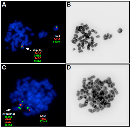 - Roug, A.S.; Wendtland, P.; Bendix, K.; Kjeldsen, E. Supernumerary isochromosome 1, idic(1)(p12), leading to tetrasomy 1q in Burkitt lymphoma. Cytogenet. Genome Res. 2014, 142, 7–13. [Google Scholar] [CrossRef]