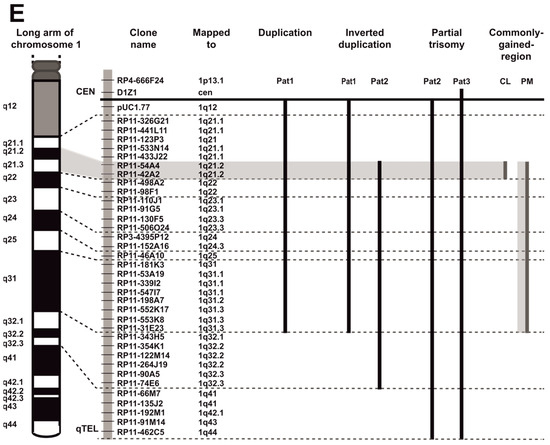 Analysis of the 1q abnormalities using dual-color metaphase FISH. Representative images showing 1q duplication (A) and inverted duplication (C) in patient-1 using the BAC clones RP11-553K8 (green) and RP11-42A2 (red). The abnormal chromosomes are indicated by arrowheads. In (A,C), representative dual color FISH images are shown and in (B,D), the corresponding G-banding images are shown (E) Summary of the 1q aberrations achieved by FISH on primary material. The BAC clones selected for this study and their cytogenetic positions are indicated on the right side of the 1q ideogram. The vertical lines indicate the overrepresented chromosomal region as assessed by FISH and correspond to the following patients (from left to right); duplications: patient-1; inverted duplications: patients-1 and -2; partial trisomies: patients-2 and -3. The minimal commonly gained-region 1q21.2–q22 delineated in our previous report using BL-CLs [33] is shaded in grey and indicated with CL (cell lines), and the commonly gained region 1q21.2–q32 delineated in our present study using primary material is indicated with PM (primary material). Pat1–3: Patient-1–3.