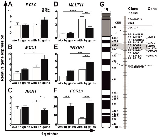 We observed similar BCL9 expression in all investigated groups with a slight increase in EBV+ BL-CLs with 1q gains (Figure 2A). Compared to EBV+ BL-CLs without 1q gains, the MCL1 and PBXIP1 levels measured in EBV+ BL-CLs with 1q gains were 2-fold higher (Figure 2B,E and Figure 3). We detected 1.5-fold higher ARNT expression in EBV− BL-CLs with 1q gains compared to EBV+ BL-CLs with 1q gains (Figure 2C and Figure 3). The MLLT11 levels in EBV− BL-CLs with 1q gains were 4-fold higher compared to EBV− BL-CLs without 1q gains and 2-fold higher compared to EBV+ BL-CLs with 1q gains (Figure 2D and Figure 3). Compared to EBV− BL-CL, the FCRL5 amounts in EBV+ BL-CLs with and without 1q gains were 4-fold and 57-fold higher, respectively (Figure 2F and Figure 3).